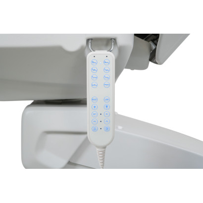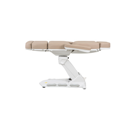 Camilla eléctrica de alta gama con función de calefacción y sistema de rotación, diseñada para ofrecer la máxima versatilidad en tratamientos estéticos, wellness y médicos. Equipada con 4 motores que permiten regular la altura, el respaldo, el asiento y el reposapiés. Incorpora giro de 110°, reposabrazos abatibles, calefacción con doble nivel de temperatura y sistema de memoria de 3 posiciones. Tapizado en PU blanco e beige de alta calidad, resistente y fácil de limpiar.