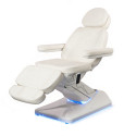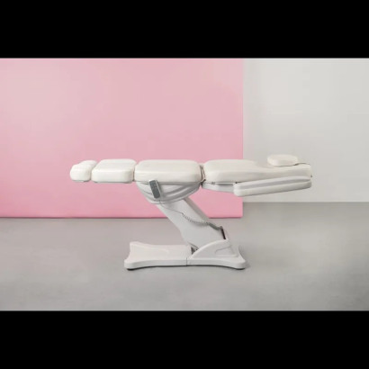 Camilla eléctrica de alta gama con función de calefacción y sistema de rotación, diseñada para ofrecer la máxima versatilidad en tratamientos estéticos, wellness y médicos. Equipada con 4 motores que permiten regular la altura, el respaldo, el asiento y el reposapiés. Incorpora giro de 110°, reposabrazos abatibles, calefacción con doble nivel de temperatura y sistema de memoria de 3 posiciones. Tapizado en PU blanco e beige de alta calidad, resistente y fácil de limpiar.