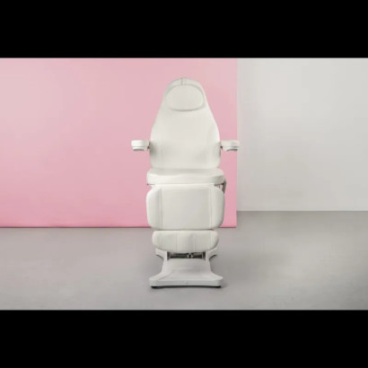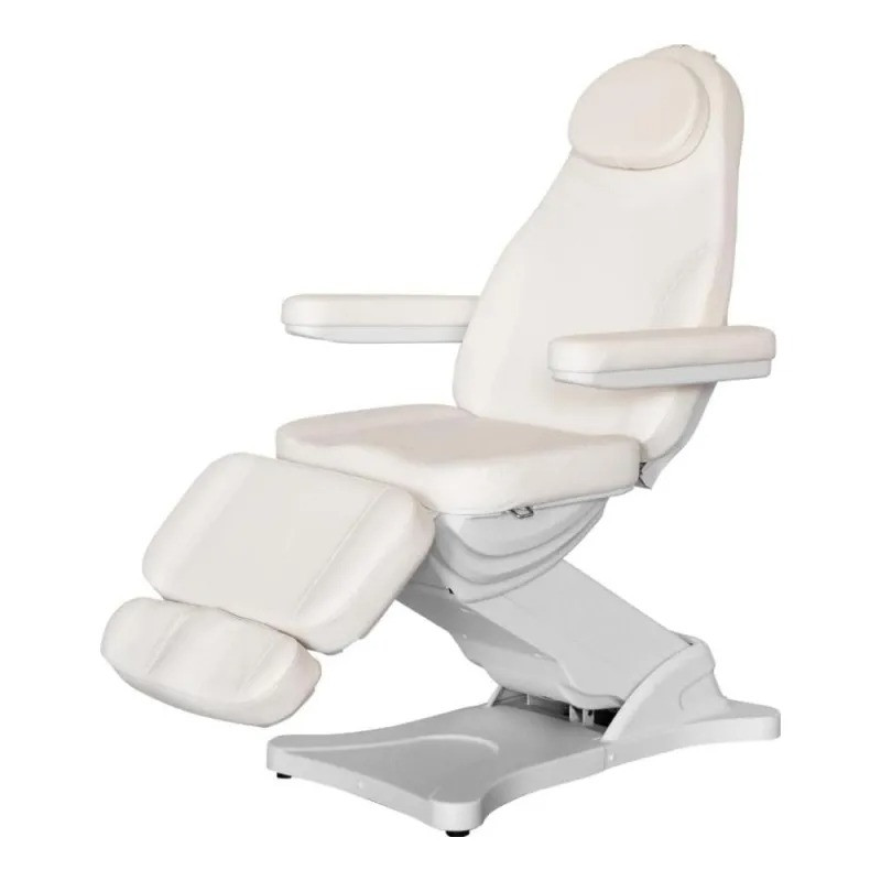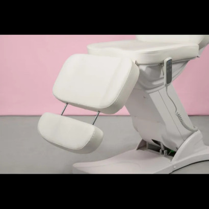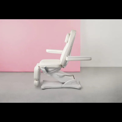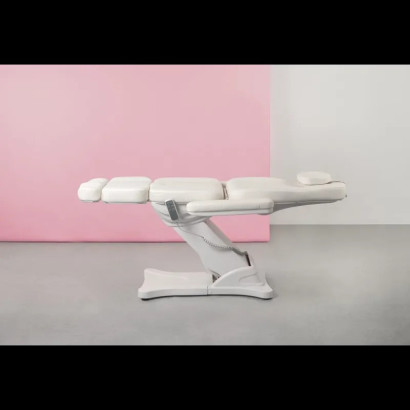 Camilla eléctrica de alta gama con sistema de rotación, diseñada para ofrecer la máxima versatilidad en tratamientos estéticos, wellness y médicos. Equipada con 4 motores que permiten regular la altura, el respaldo, el asiento y el reposapiés. Incorpora giro de 110°, reposabrazos abatibles y sistema de memoria de 3 posiciones. Tapizado en PU blanco e beige de alta calidad, resistente y fácil de limpiar.