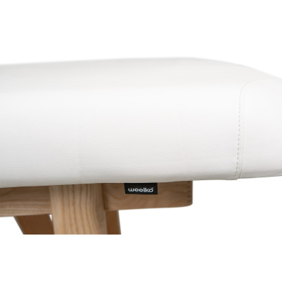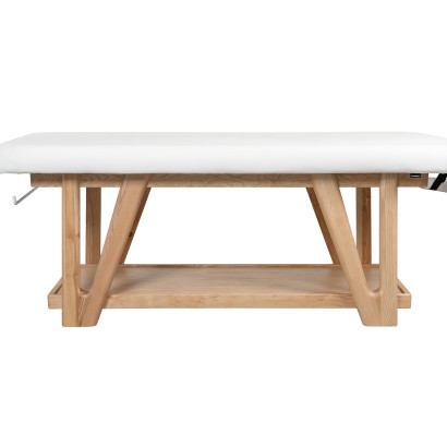 Camilla fija de madera de diseño robusto y natural, ideal para centros de masaje, bienestar y tratamientos corporales. Estructura de madera maciza con estante inferior y portarrollos integrado. Incluye colchón acolchado de gran confort y cabezal ajustable en altura, ángulo y profundidad. Reposabrazos regulables para mayor comodidad del cliente. Tapizado en PU blanco de alta calidad.