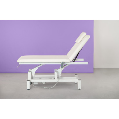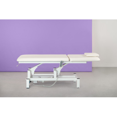 Camilla de 2 cuerpos con estructura metálica muy estable. Equipada con 1 motor que permite regular la altura mediante mando de mano. Respaldo regulable mediante pistón de gas. Cojín reposacabezas extraíble con agujero facial. Ruedas escamoteables en un extremo de la camilla que facilitan su desplazamiento. Portarrollos incluido