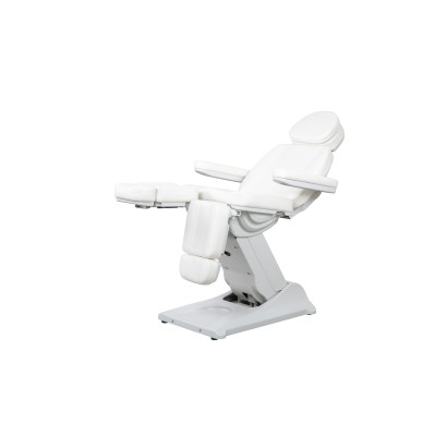 Sillón de podología de alta gama con estructura muy estable. Equipado con 3 motores que controlan la altura, la inclinación del respaldo y del asiento. Reposapiés ajustables en altura independientemente mediante pistón de gas. Reposabrazos abatibles y reposacabezas regulable con agujero facial. Tapizado blanco o gris en PU de alta calidad y fácil de limpiar. Incluye luz LED en la base.