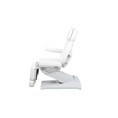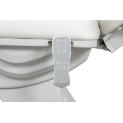 Camilla de alta gama de estilo minimalista y gran confort. Equipada con 3 motores que regulan la altura y la inclinación del respaldo y del asiento. Reposapiés regulable mediante pistón de gas. Reposabrazos abatibles. Tapizado blanco en PU de alta calidad sin costuras y fácil de limpiar. Incluye mando de mano.