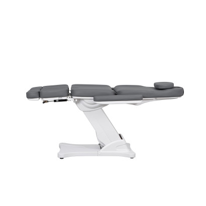 Camilla de estética de 3 secciones con estructura muy estable. Equipada con 3 motores que controlan la altura, la inclinación del respaldo y del reposapiés. Reposabrazos abatibles y extraíbles. Agujero facial con cojín reposacabezas