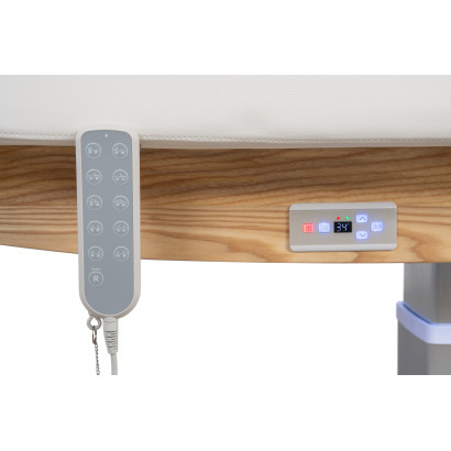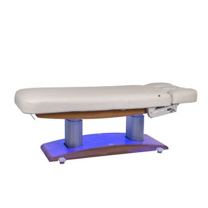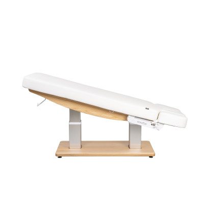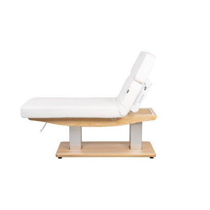 La cama Troch es una cama profesional de spa, diseñada para ofrecer el máximo confort durante tratamientos de belleza o bienestar. Está equipada con 4 motores eléctricos que permiten ajustar la altura, el respaldo, el reposapiés y la inclinación general de la cama. El colchón monobloque de 3 secciones garantiza una estabilidad óptima. Su acolchado ultra suave y el revestimiento en PU de alta calidad aseguran una comodidad duradera. Además, la estructura metálica con acabado en madera natural le da un toque elegante y moderno. La cama está equipada con un sistema LED con colores intercambiables, permitiendo crear una atmósfera personalizada para cada tratamiento. También incluye un soporte para rollo de papel, práctico para su uso en salones.