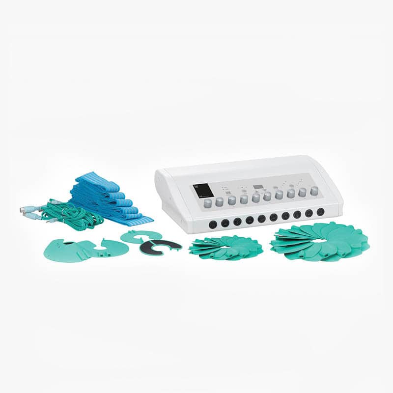 Equipo con electrodos de gimnasia pasiva que facilitan el adelgazamiento y la tonificación muscular. Frontal de 10 salidas.