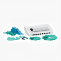 Equipo de masaje vibratorio corporal equipado con 5 cabezales para distintos tratamientos. Unidad digital ubicada en columna con base de ruedas y bandeja para la colocación de los cabezales.