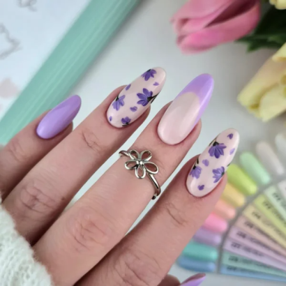 Esmalte semipermanente UV/LED violeta pastel semitransparente con partícula brillante sutil. Textura cremosa y acabado luminoso elegante.
