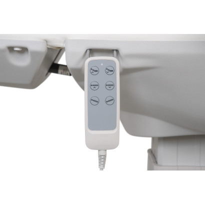 Fauteuil de podologie avec structure robuste et 3 moteurs pour régler la hauteur, le dossier et l\'inclinaison de l\'assise. Repose-jambes réglable manuellement par vérin à gaz, accoudoirs rabattables et appui-tête avec ouverture faciale. Télécommande à main incluse.