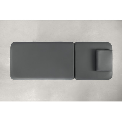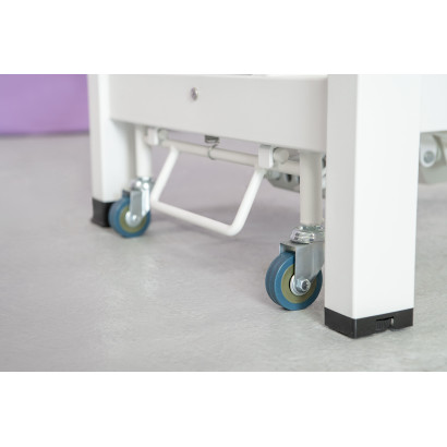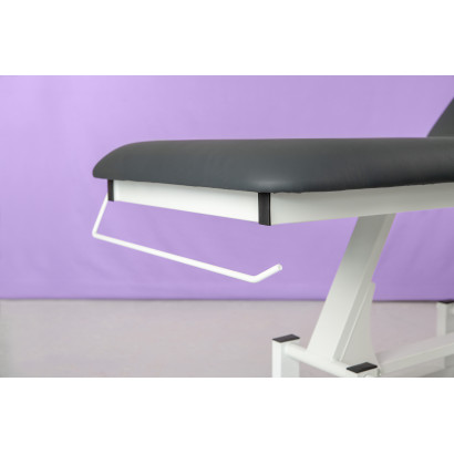 Table à 2 plans avec structure métallique très stable. Équipée d’un moteur permettant le réglage en hauteur à l’aide d’une télécommande à main. Dossier réglable par vérin à gaz. Coussin repose-tête amovible avec ouverture faciale. Roulettes escamotables à une extrémité de la table facilitant son déplacement. Porte-rouleau inclus.
