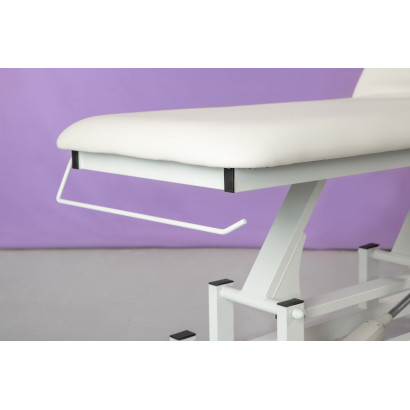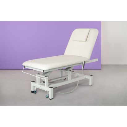 Table à 2 plans avec structure métallique très stable. Équipée d’un moteur permettant le réglage en hauteur à l’aide d’une télécommande à main. Dossier réglable par vérin à gaz. Coussin repose-tête amovible avec ouverture faciale. Roulettes escamotables à une extrémité de la table facilitant son déplacement. Porte-rouleau inclus.