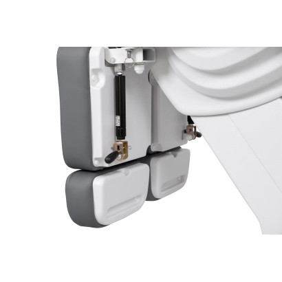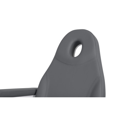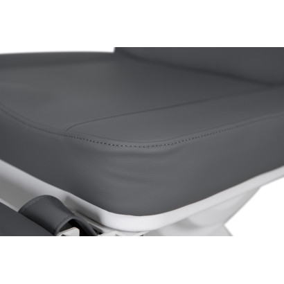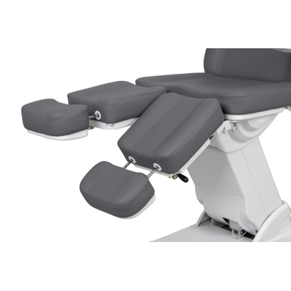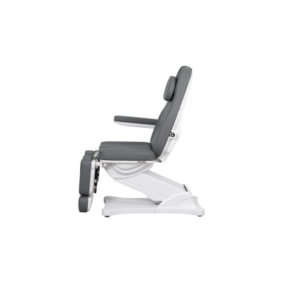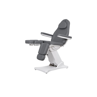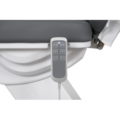 Fauteuil de podologie avec structure robuste et 3 moteurs pour régler la hauteur, le dossier et l'inclinaison de l'assise. Repose-jambes réglable manuellement par vérin à gaz, accoudoirs rabattables et appui-tête avec ouverture faciale. Télécommande à main incluse