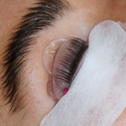 Placez le shield sur la paupière sans adhésif et soulevez délicatement les cils dessus.