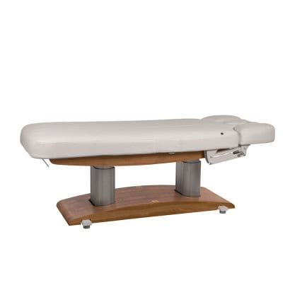 Table de massage robuste et minimaliste équipée d’un moteur électrique pour régler la hauteur. Le dossier est inclinable grâce à un vérin à gaz, et le revêtement en polyuréthane (PU) blanc est facile à nettoyer. Inclut un porte-rouleau intégré et une base métallique stable avec deux roues pour une mobilité aisée.