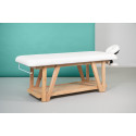 Table de spa fixe 2 plans fabriquée en bois coloris wengué avec base foncée, dotée d’un dossier réglable manuellement (0º à 45º), d’un trou facial avec repose-tête réglable et d’une plateforme inférieure de rangement.