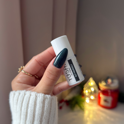 Vernis semi-permanent "Elf Yourself!", un vert bouteille profond et luxueux, illuminé par une subtile particule multicolore. Sa formule crémeuse et auto-égalisante assure une manucure festive impeccable.